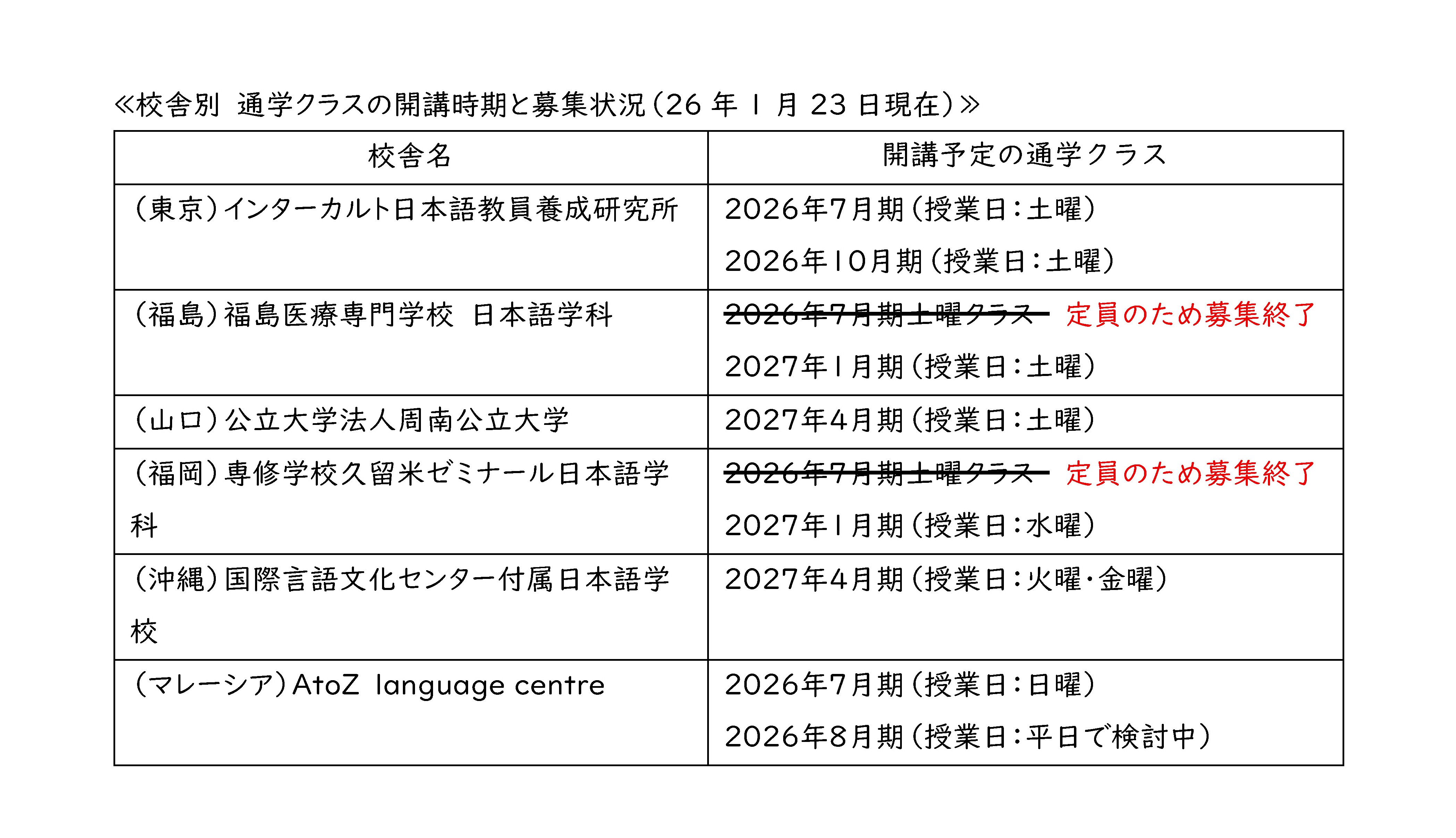 【登録日本語教員養成課程420単位時間一体型コース】校舎別 募集状況2026.1.23時点